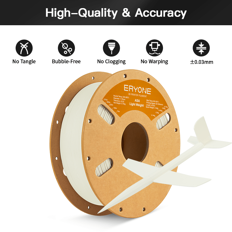 ASA Light-Weight Filament offers exceptional dimensional accuracy at 1.75mm±0.03mm, ensuring smooth 3D printing with minimal jams.